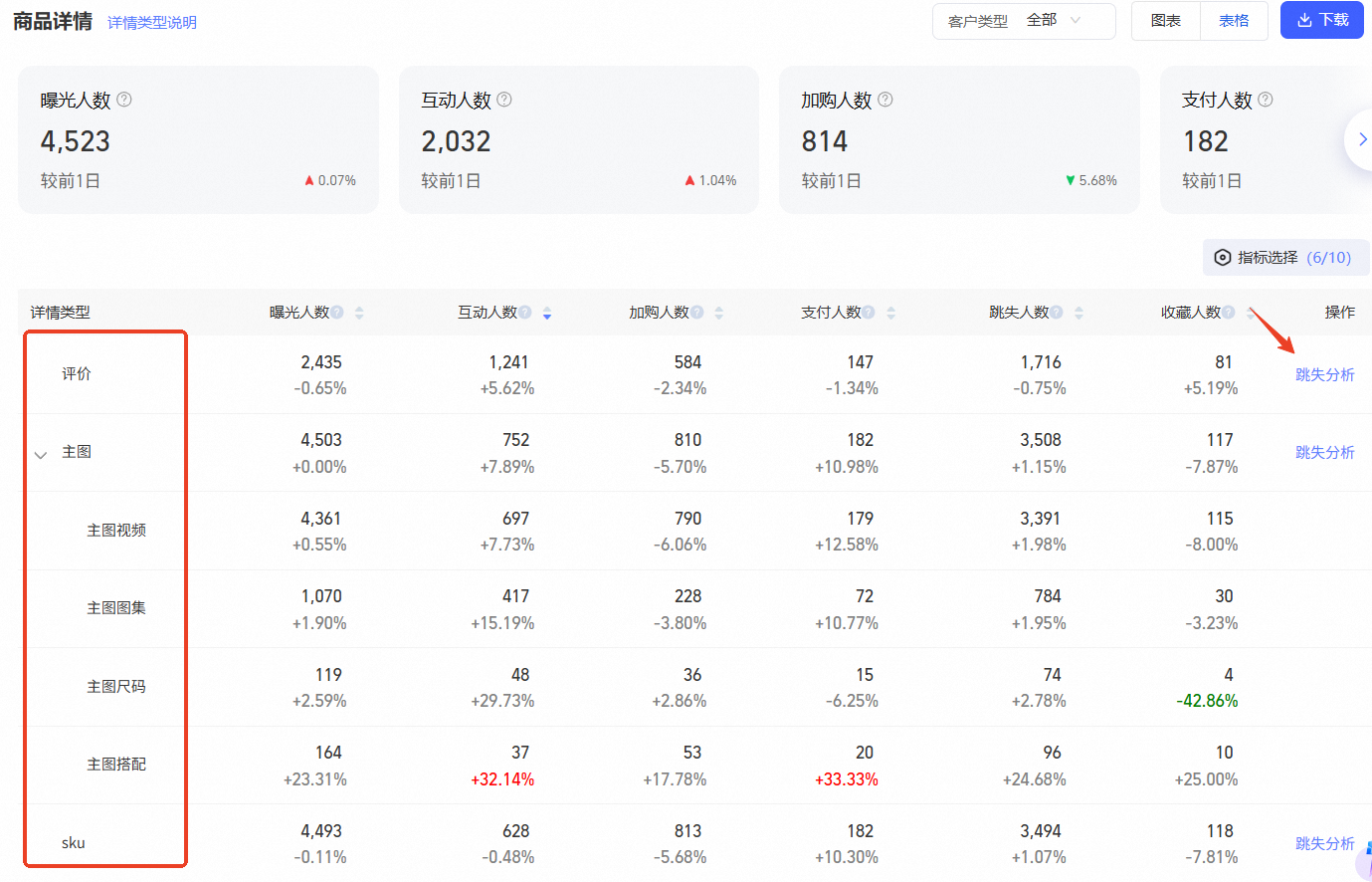 以下为表格模式,数据指标罗列为主,同时支持跳失分析,点击进一步查看从该模块跳失的消费者下一步去了哪里,分析去向的竞对模块是否展示得比本店优秀。