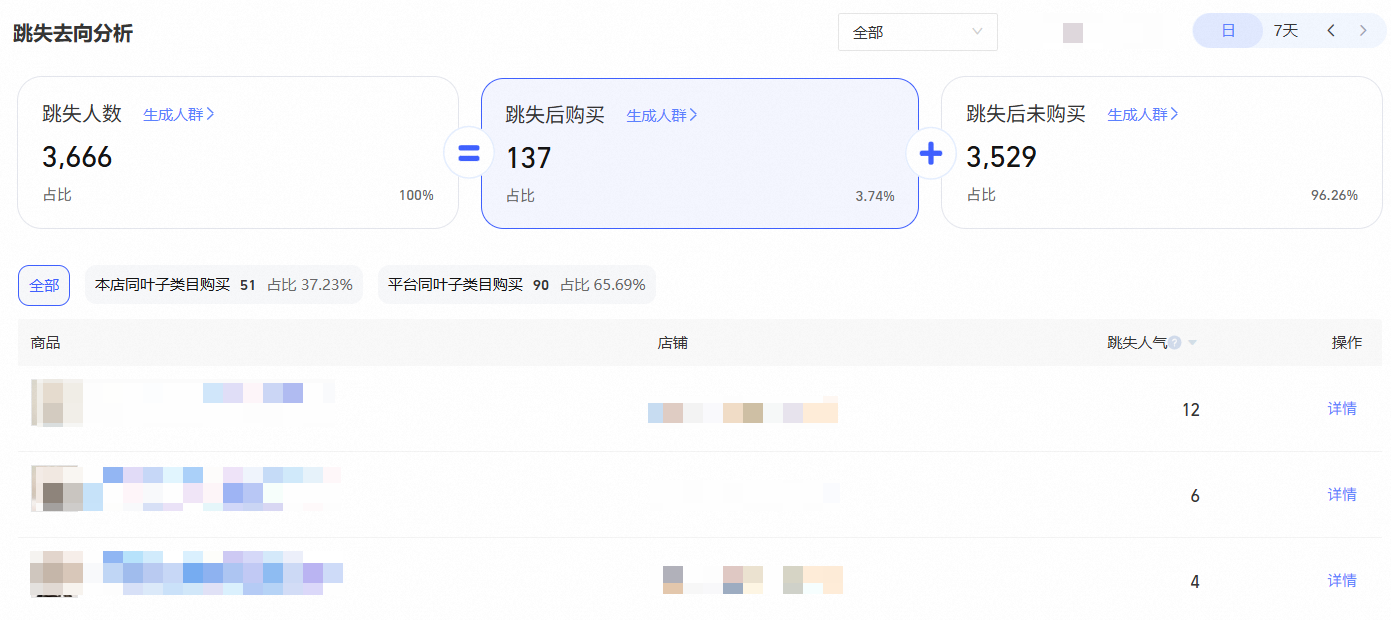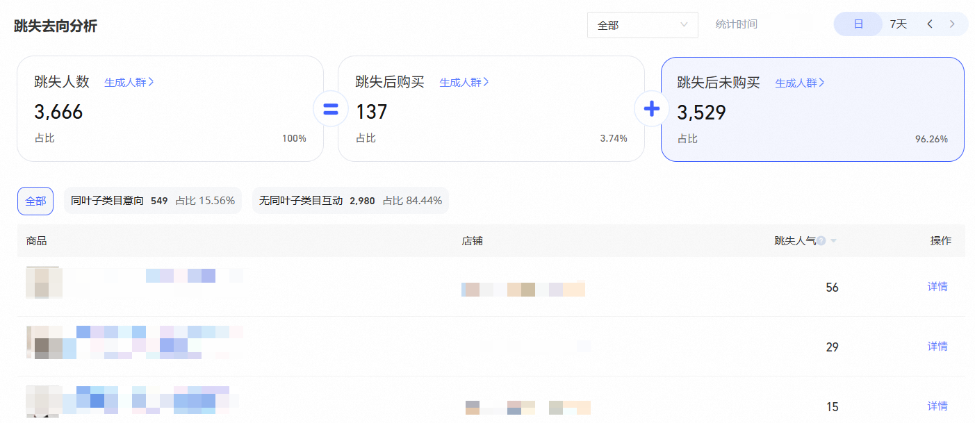 下拆商详整体和分模块的跳失人群,拆分为跳失已购和跳失未购,商家可以分别针对性运营