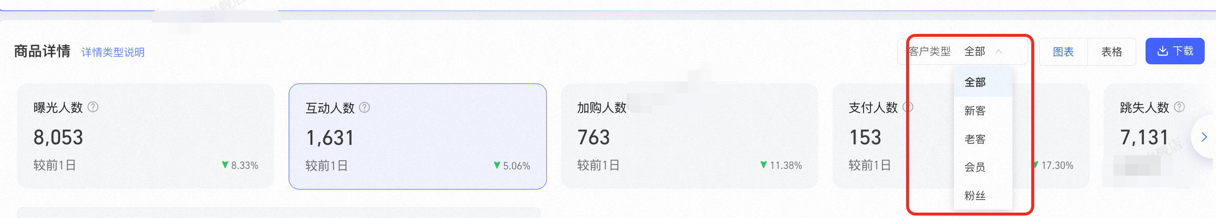 同时支持拆分客户类型,区分新客、老客、会员和粉丝客群,查看不同人群的各模块点击转化流失效率,帮助商家分模块优化、权益表达和消费者沟通更贴合人群特性。