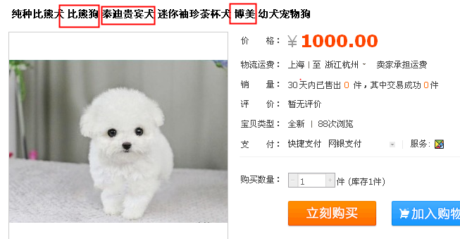 2.标题品类不一致堆砌:指标题里出现多个品类的关键词,如:标题同时出现如博美犬、贵宾犬、比熊犬三种品种。