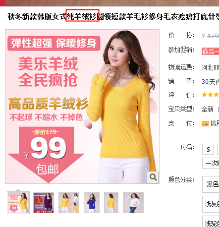 案例1:标题里的属性值与描述里的属性信息互斥。如标题里材质属性的属性值是纯羊绒,描述里的属性值是非95%以上的羊绒。