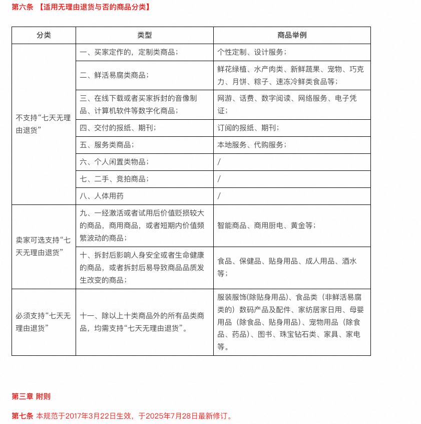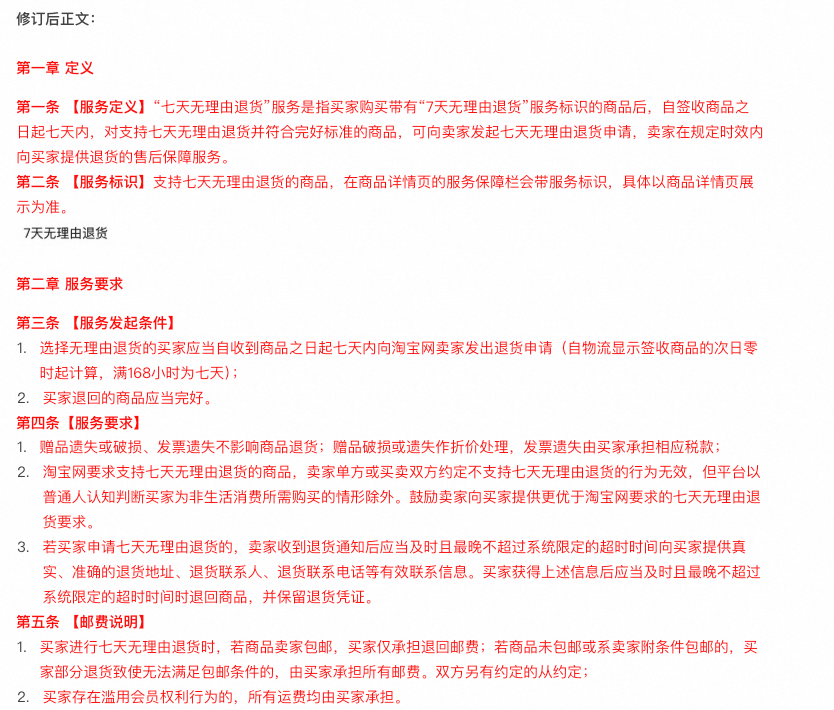 为便于买家、卖家阅读和理解《淘宝网七天无理由退货规范》,平台拟针对《淘宝网七天无理由退货规范》的行文结构及整体内容进行调整,同时对部分商品的特殊完好标准进行补充与调整。此次规则变更于2025年7月21日进行公示通知,将于2025年7月28日正式生效。点此查看详情 主要变更点: 1、调整《淘宝网七天无理由退货规范》的行文结构与文字表述; 2、调整部分商品的特殊完好标准。
