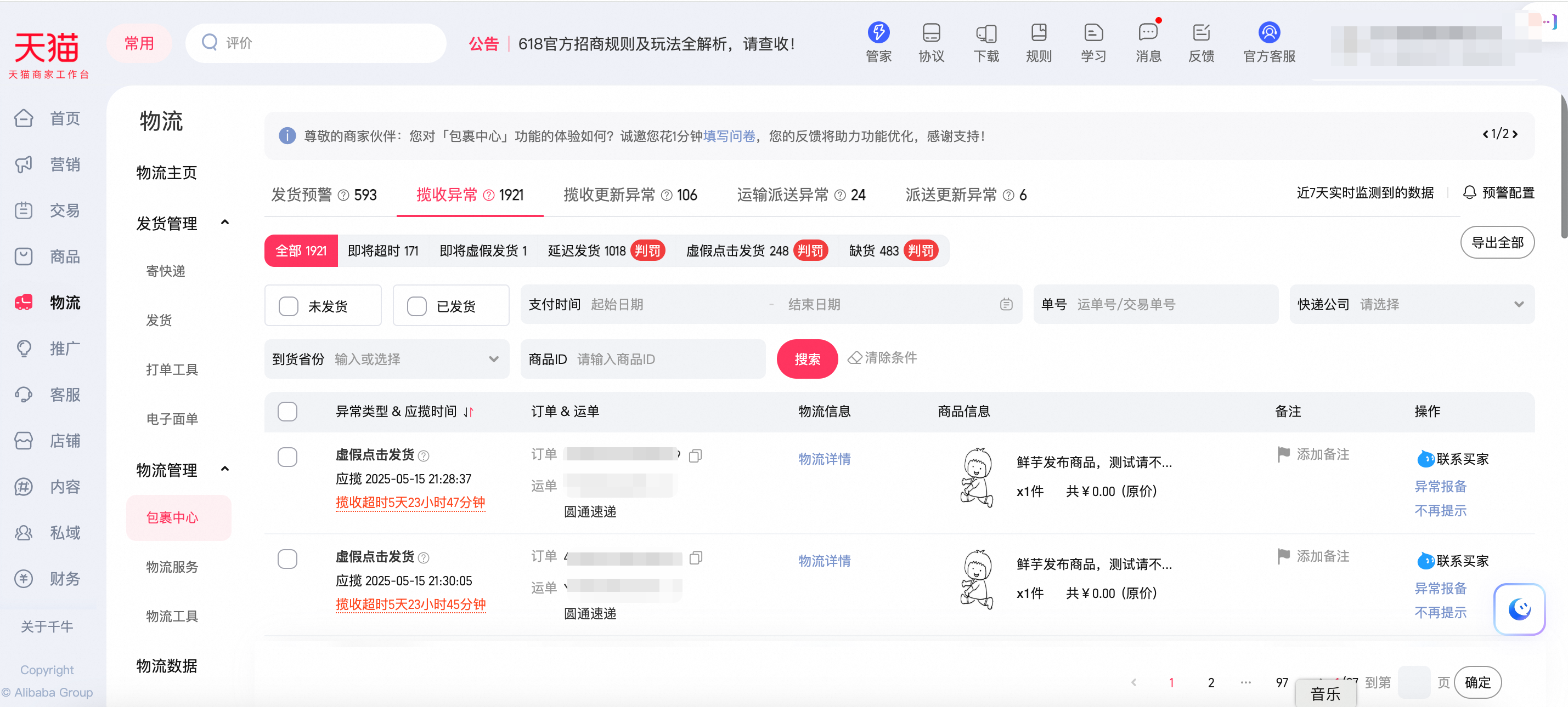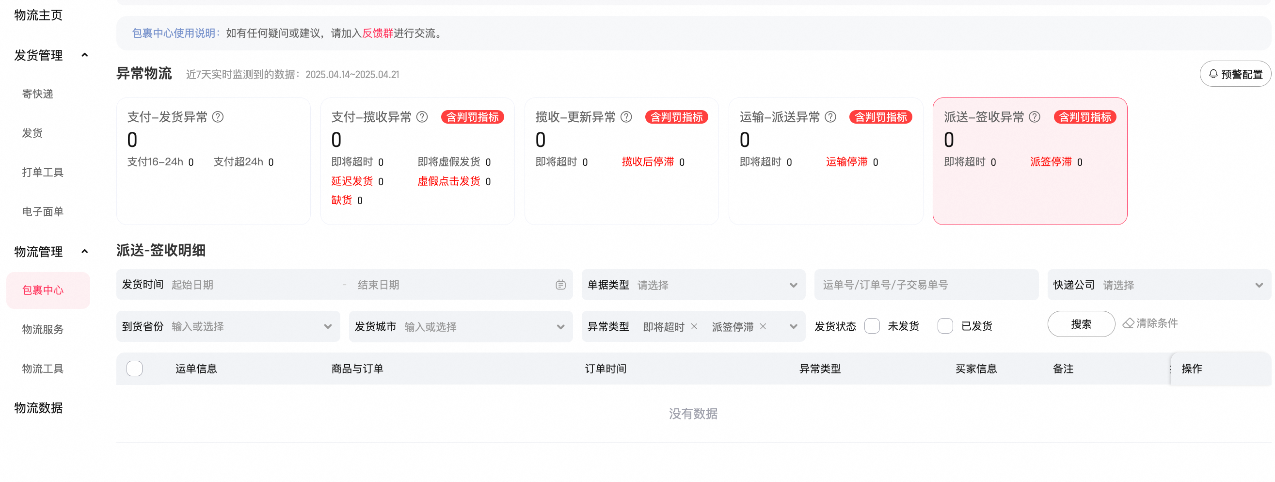 方式2:在【交易-物流管理-包裹中心】看到异常包裹明细,分析并定位原因,及时关注支付-发货异常、支付-揽收异常订单