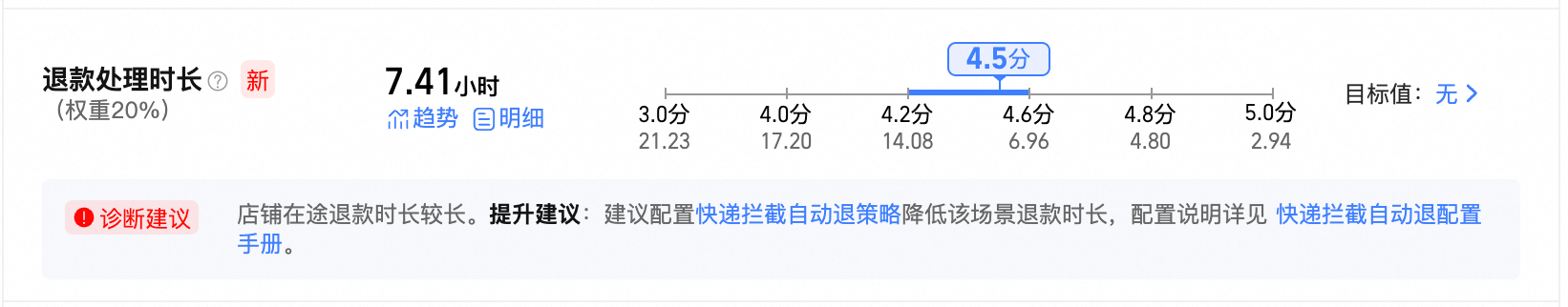 考核周期内,退款成功的订单量 ≥1 单时,退货订单从消费者发起退款时间至商家同意退款时间和退货物流显示签收时间至退款完结时间的平均时长;其中发起退款订单,从消费者发起退款时间至退款完成时间的平均时长