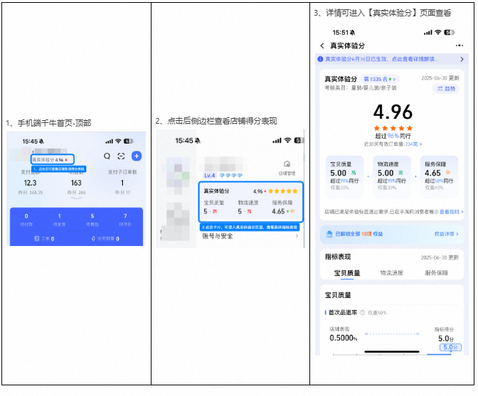 电脑端【千牛-店铺-真实体验分】查看真实体验分数据表现。