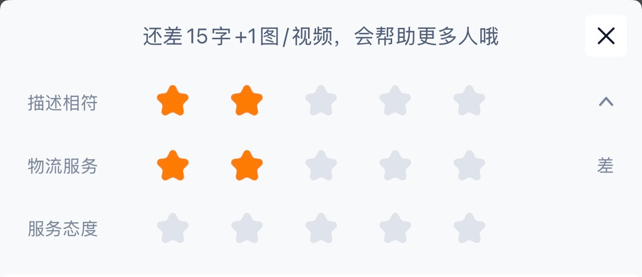 物流差评率(部分类目考核) | 考核周期内,消费者针对“物流服务”的评价1 星或 2 星的订单量占同期店铺确认收货订单笔数比例 | 前30天至前1天(T-30~T-1) | |