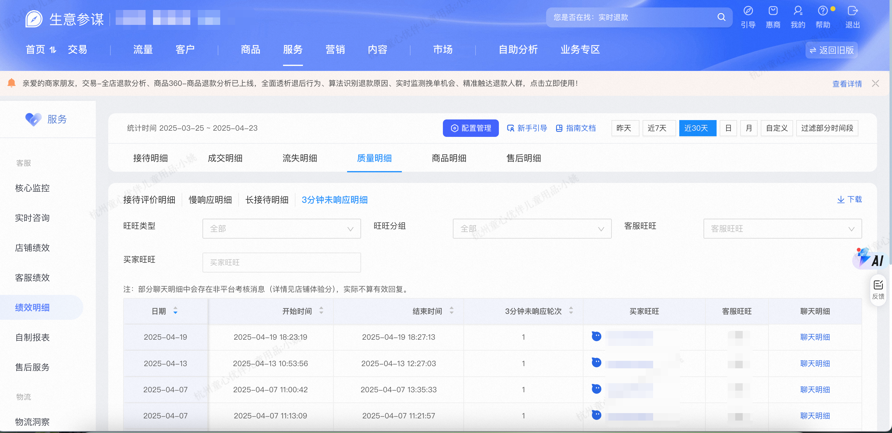 服务保障 | 旺旺3分钟人工响应率 | 考核周期内,旺旺咨询接待对话轮次≥100 轮时,在工作时间段内(8:00:00~22:59:59)消费者咨询后3分钟内人工回复的对话轮次占同周期该时段总对话轮次比例 | 前30天至前1天(T-30~T-1) |