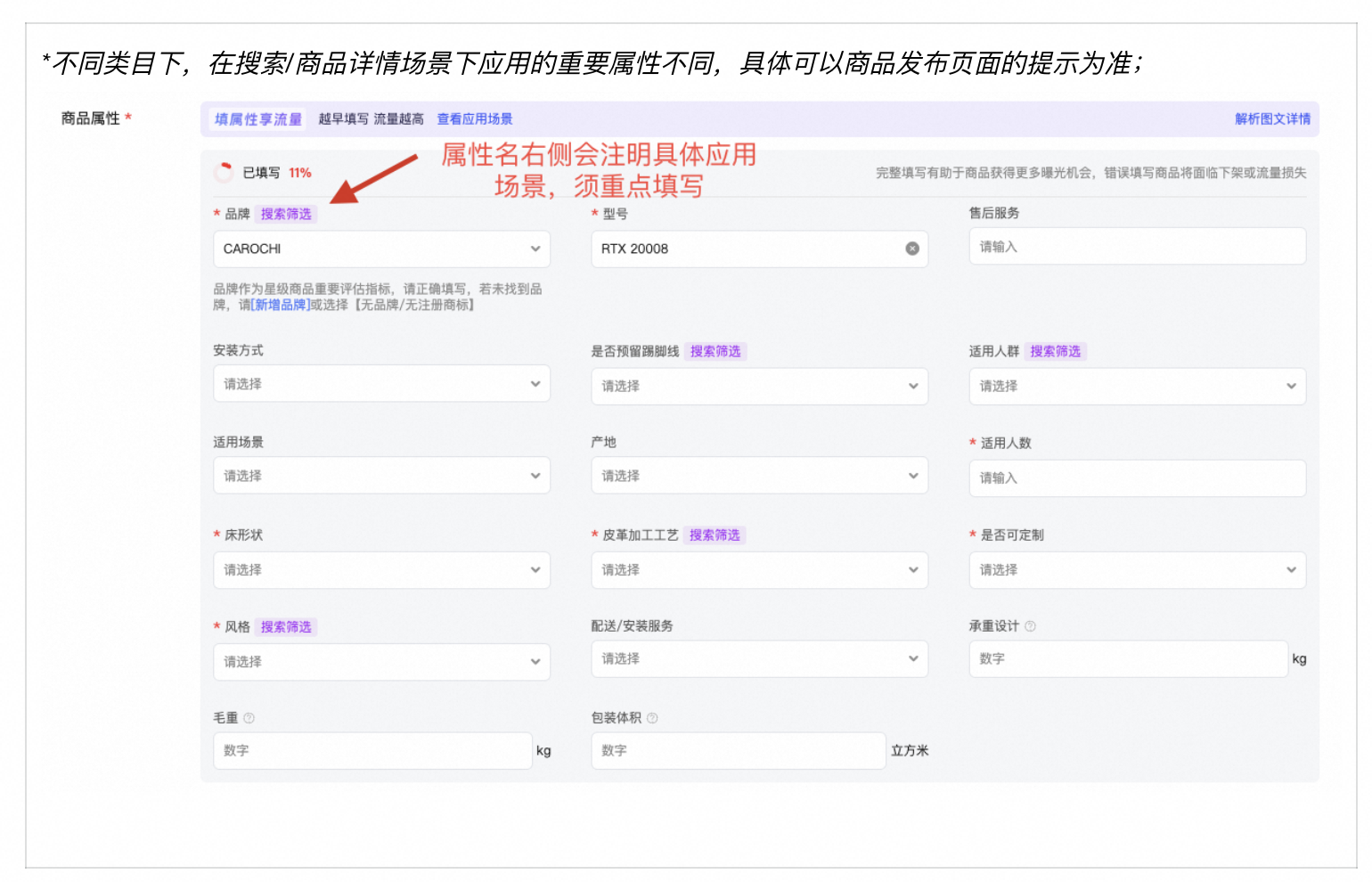 商品属性模块会表达属性的应用场景,并提供以下两种填写提效能力: