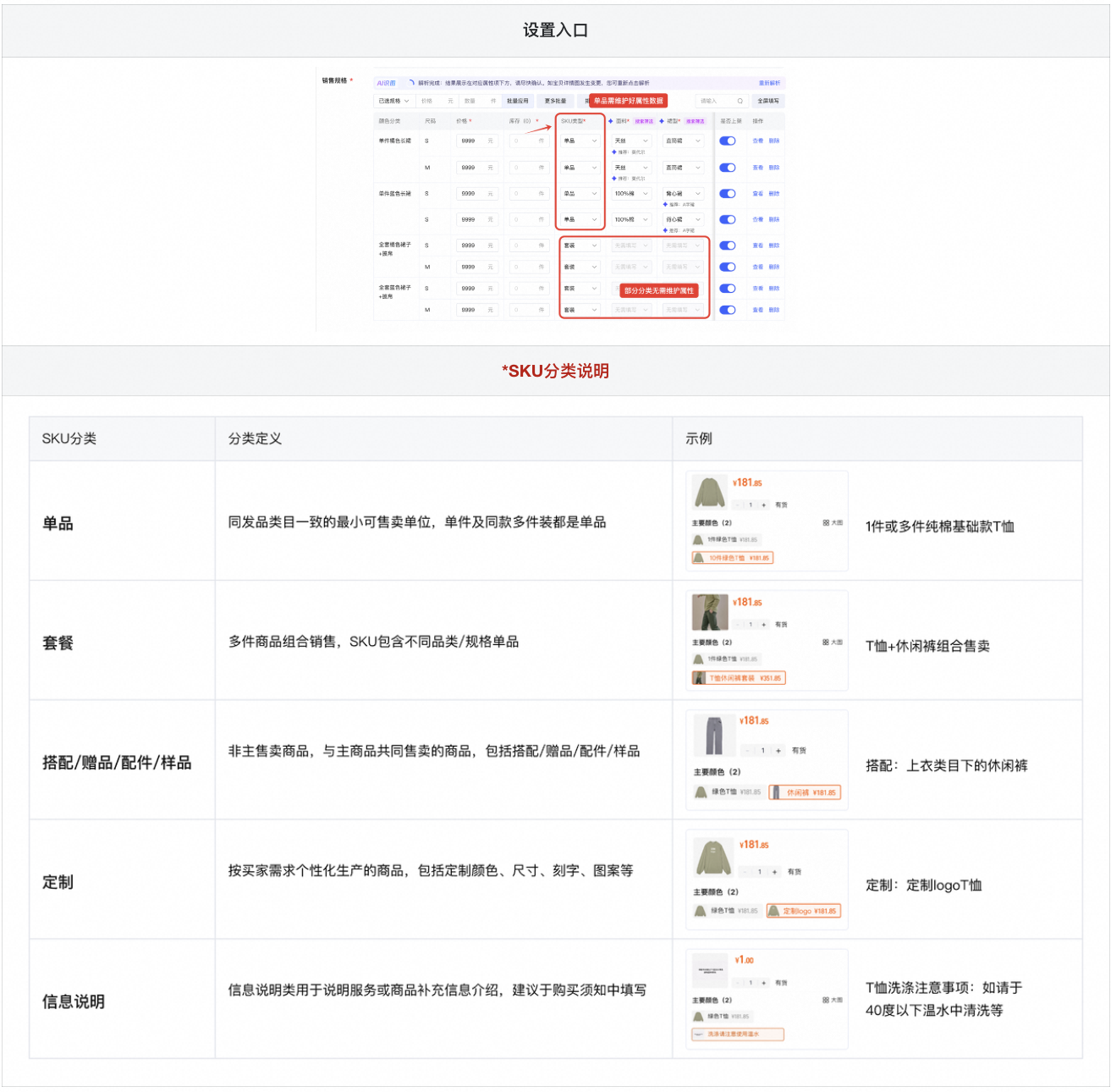 SKU分类决定SKU属性信息采集,完成销售属性设置后,请在销售规格列表进行SKU分类设置。分类错误会导致属性信息缺失或错误,影响商品搜索流量获取,请务必准确选择。