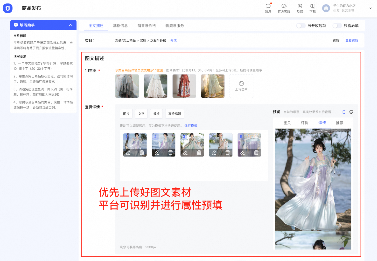 选择类目后,在图文描述模块上传商品完整的图文素材(包括不限于1:1/3:4主图、白底/透明图、吊牌图、图文详情),平台能够更智能识别预填商品属性信息,减少后续手动填写的成本;
