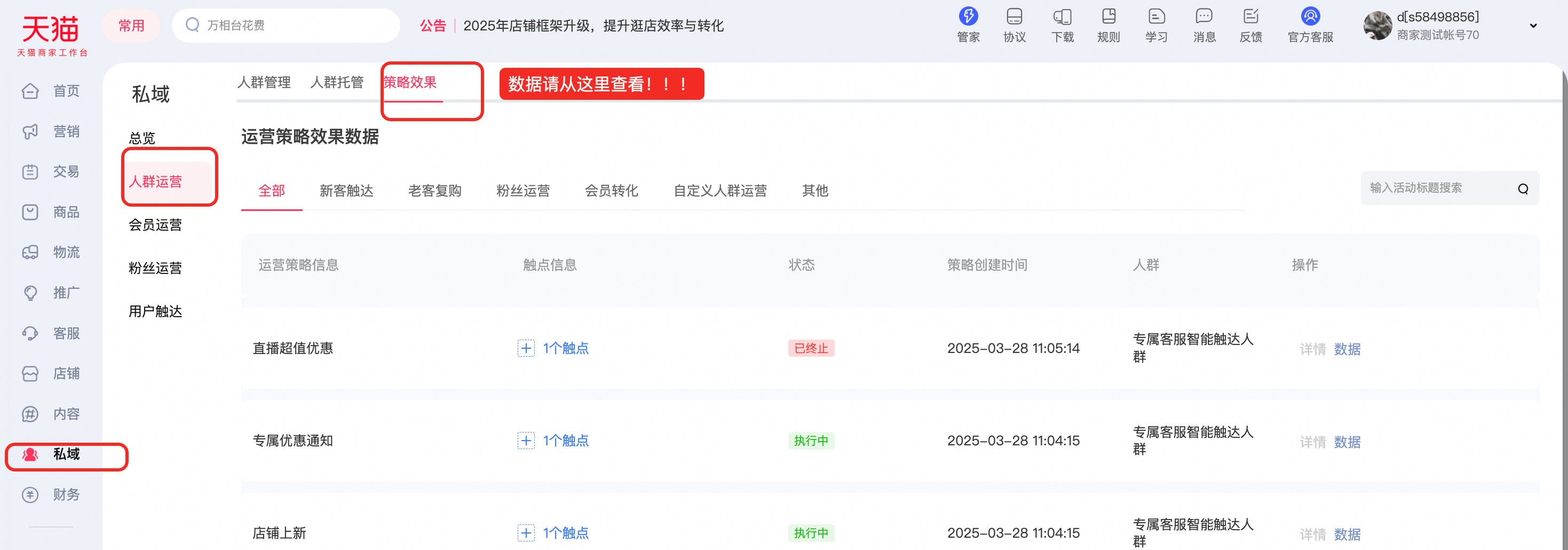 2、原一级菜单「策略效果」页面的访问入口调整至“人群运营” 页面。