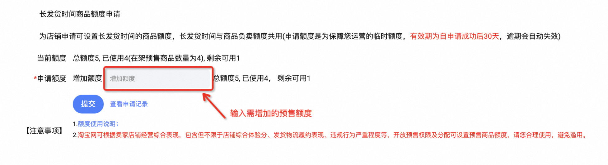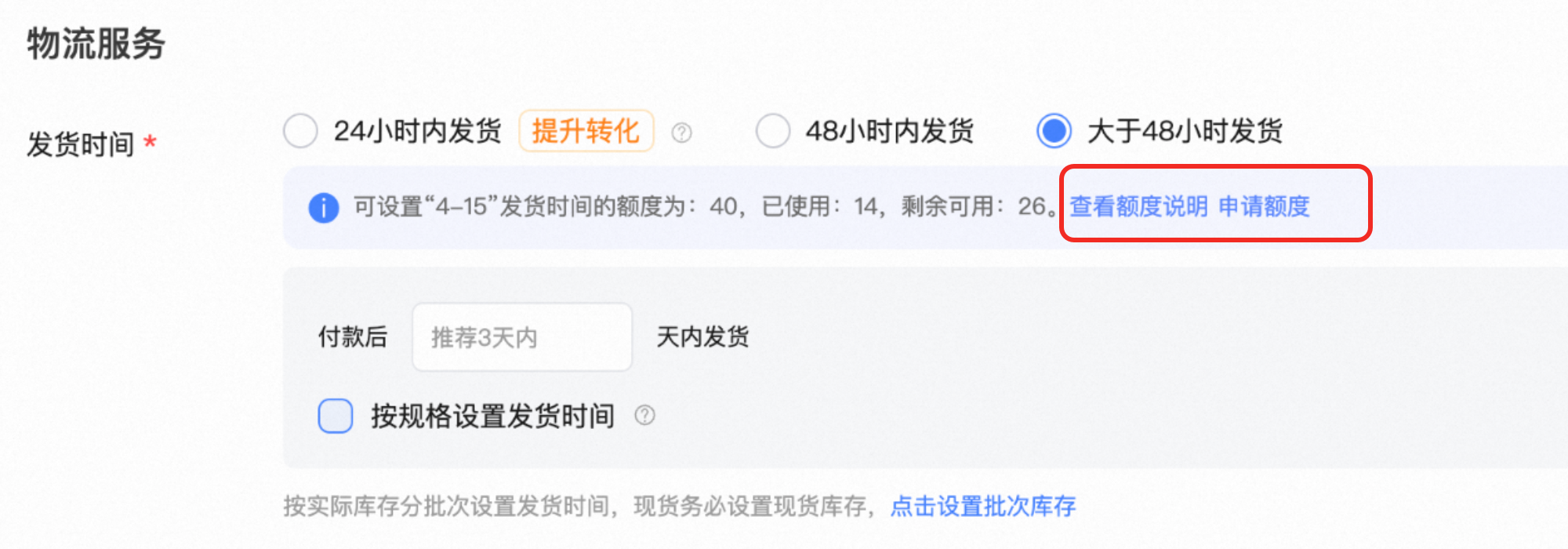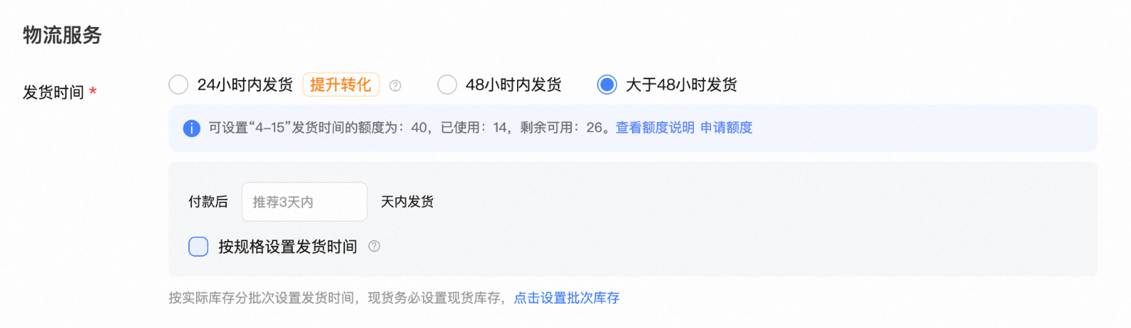剩余可用:代表剩余可设置4-15天内发货时间的商品额度