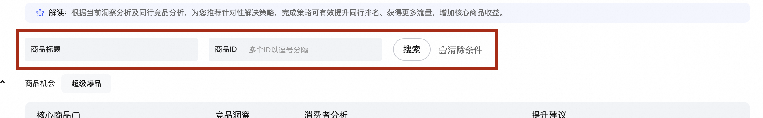 商家可以通过【商品标题】或【商品ID】筛选想要重点关注或运营的商品。