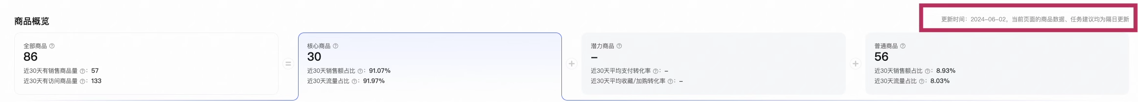 目前商品页面的数据更新为隔日更新,商家可以通过查看页面右上角的更新时间来确定具体的数据更新时间。