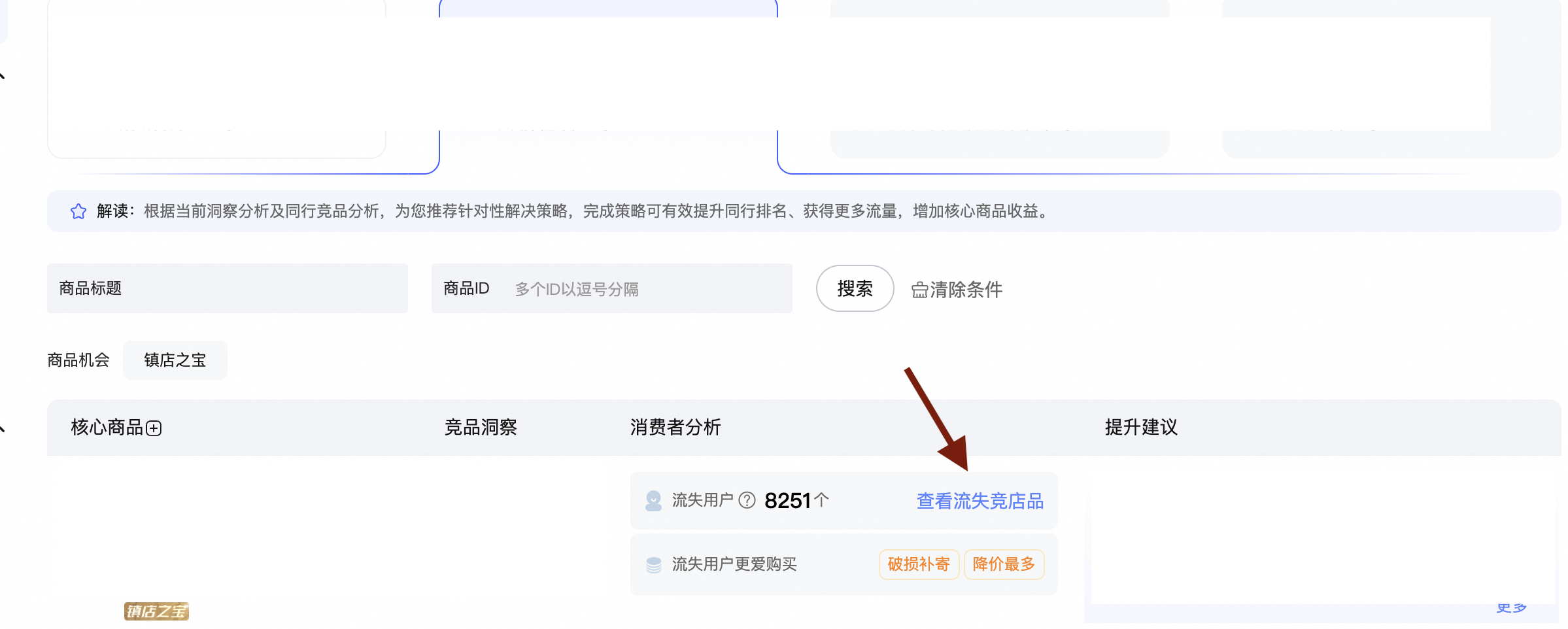 点击【消费者分析】即可查看流失竞店的商品。【流失竞店】指商品浏览用户浏览过的同款商品。
