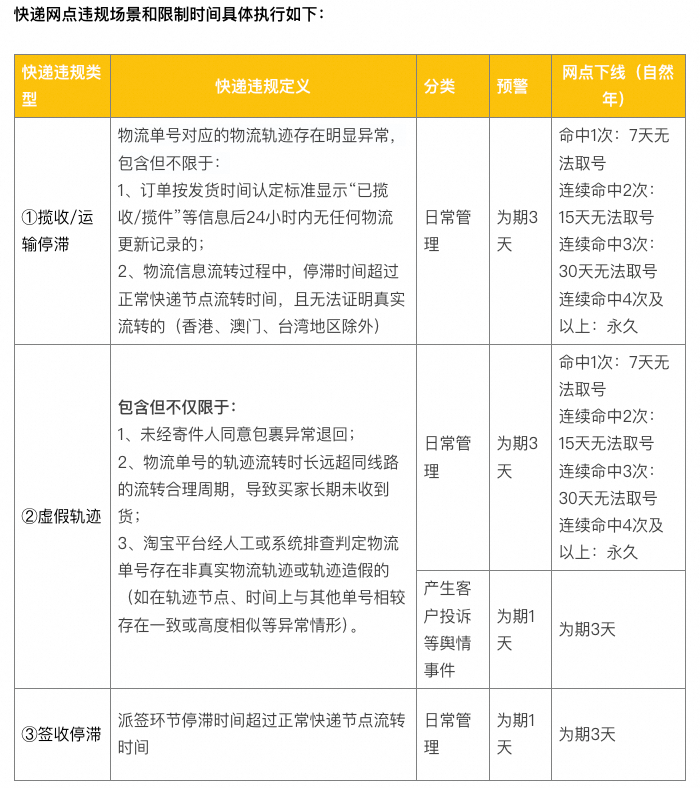 为避免影响卖家正常发货和买家体验,卖家合作的快递网点存在严重物流轨迹异常的情形的,平台将向卖家和快递公司发送预警通知。卖家收到预警通知后,请于提示的天数内及时开展自检自查并替换合作快递及网点,预警通知结束后淘宝平台会对快递网点做“下线”处理,即届时卖家将无法通过该网点下单发货。