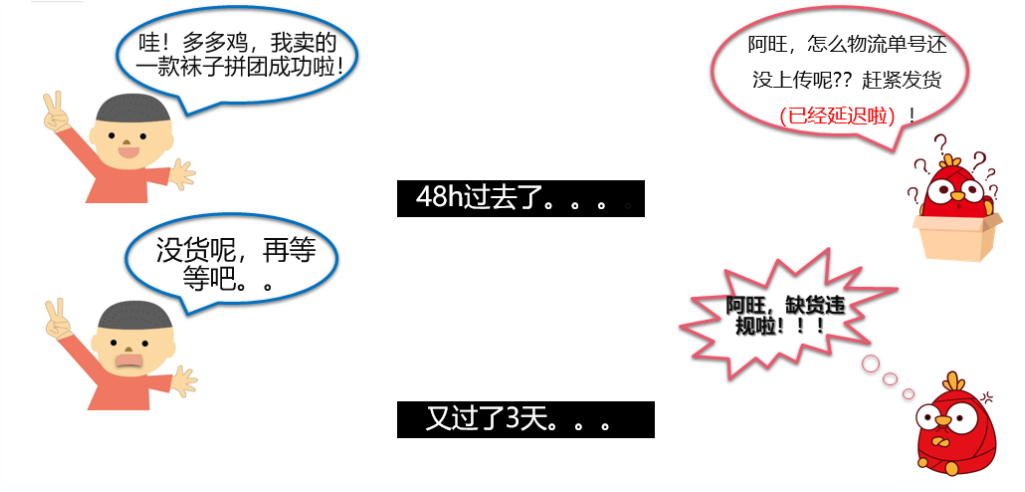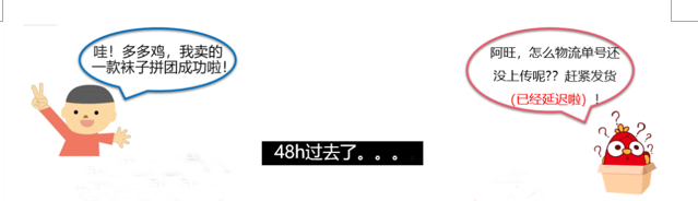 2)对于无物流公司回传信息的订单:(1)商家未在发货时限内完成发货;或(2)平台未在发货时限内收到充值成功信息;或(3)商家未在发货时限内回传卡密信息至拼多多平台;或(4)商家未在发货时限内按照平台要求以其他方式完成发货的。