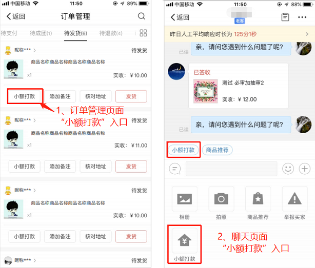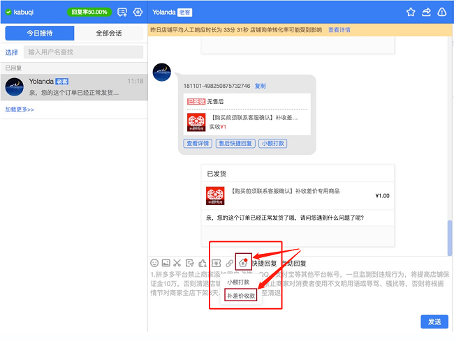 (3)利用“补差价收款卡片”功能,在客服平台将差价收款卡片发送给用户,用户下单支付即可,高效便捷。