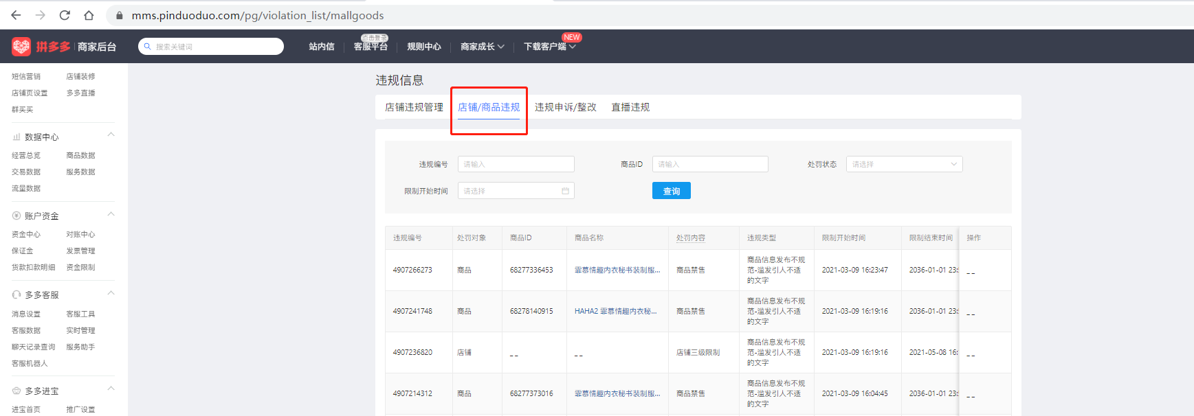 路径:拼多多商家【管理后台】-【店铺管理】-【违规信息】-【店铺/商品违规】查看被限制的原因,也可以查看站内信通知核实。