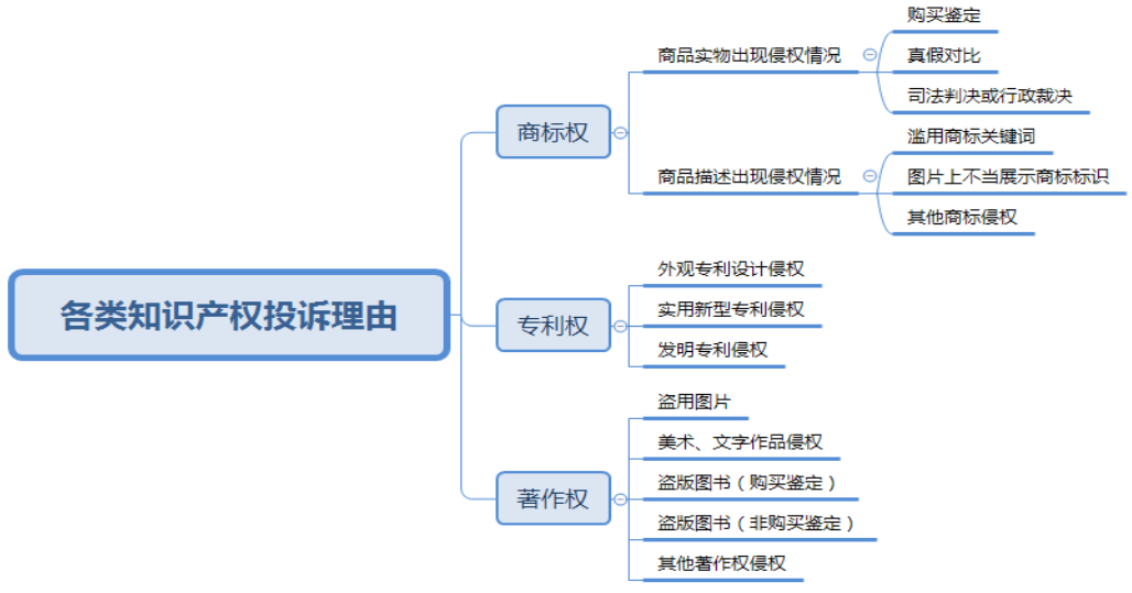 知识产权侵权投诉理由主要分为三大类,即商标权、专利权和著作权。具体侵权投诉理由汇总如下: