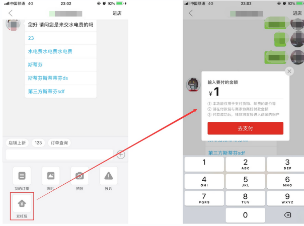 (2)利用“发红包功能”,当用户需要给商家打款时,比如补差价等,可以引导用户使用发红包功能来给商家打款。