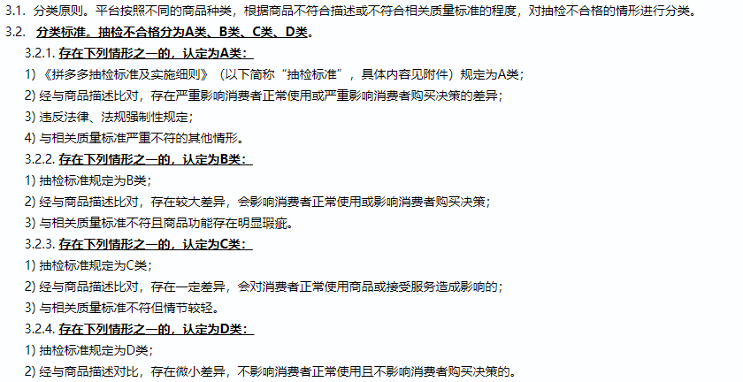 平台按照不同的商品种类,根据商品不符合描述或不符合相关质量标准的程度,对抽检不合格的情形进行分类。