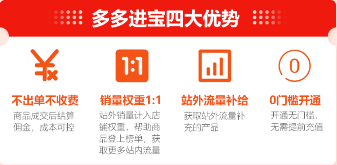 多多进宝是0门槛、按成交结算佣金的推广神器。商家通过设置券佣的形式,将商品给到站外推手进行推广,获取站外流量,无订单不收费。
