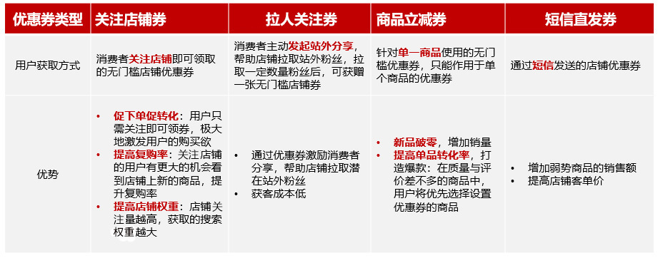 我们平台的用户绝大多数是对价格敏感,追求性价比的用户群体,因此如果你可以为商品设置相应的高额优惠券,便可以获得更高的店铺权重,并提高商品对用户的吸引力。我们平台的优惠券有很多,本次课程将重点围绕“拉新粉丝”这一重要目的为大家推荐关注店铺券、拉人关注券、商品立减券与短信直发券。