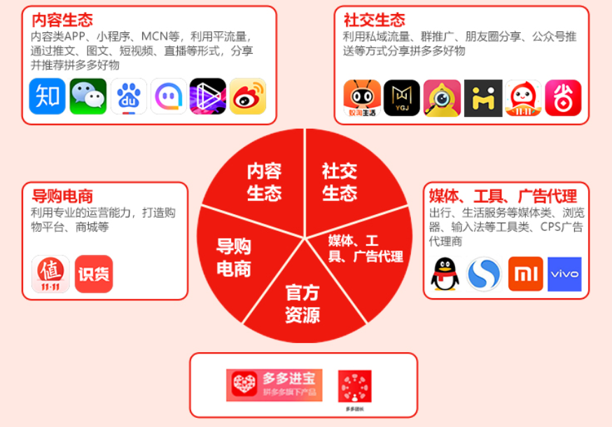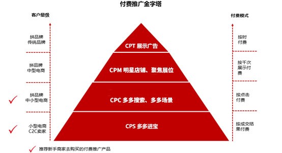 目前拼多多营销推广部门共推出了4种付费推广模式,分别为:CPS 模式下的多多进宝;CPC 模式下的标准推广;CPM 模式下的明星店铺与CPT模式下的展示广告。