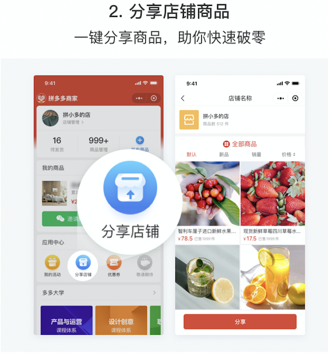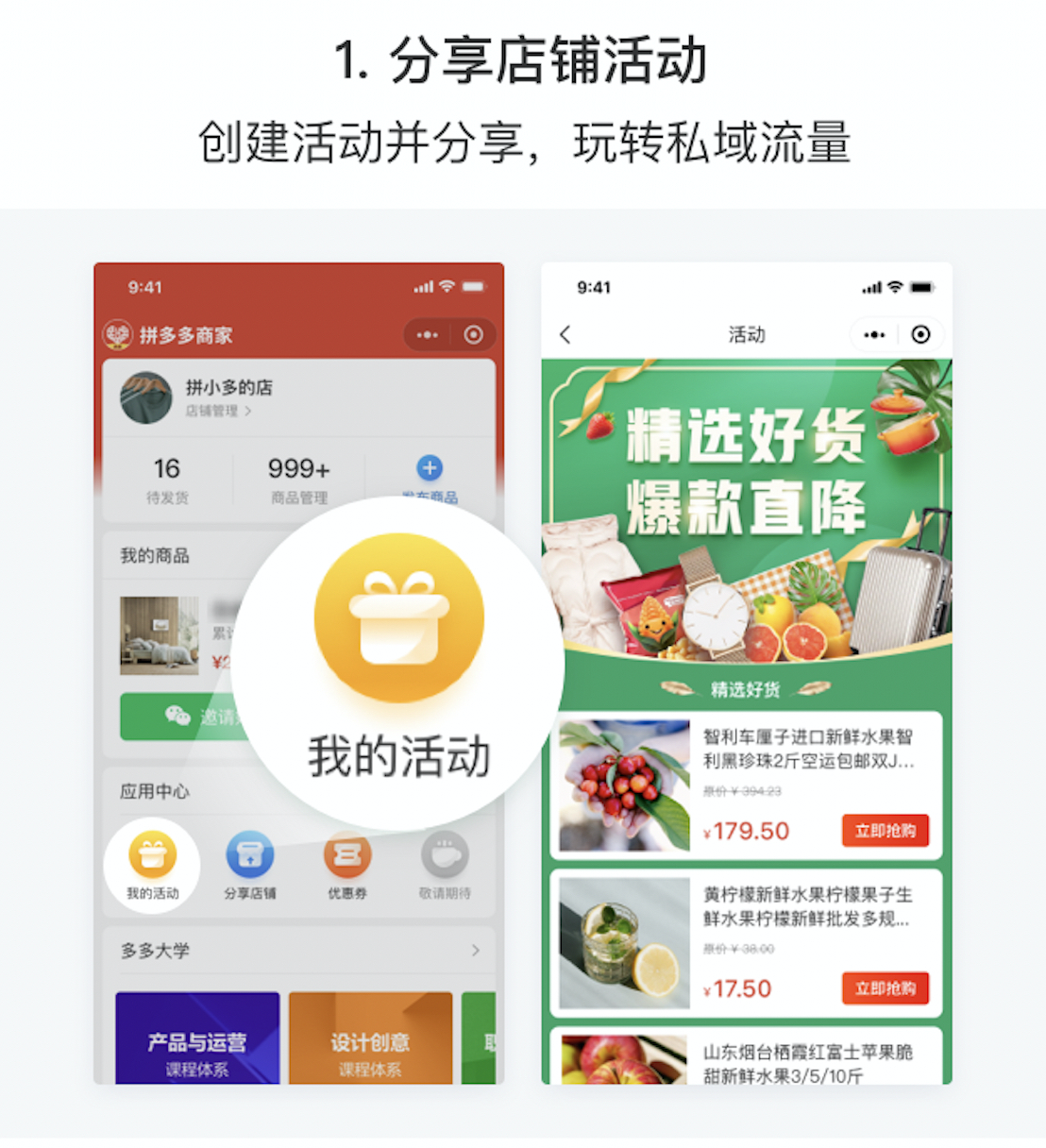 商家小程序可以让你随时随地都可分享自己的商品,帮助你快读破零,玩转私域流量。此外,还有「营销活动」和「店铺分享」模块。让你可以拥有自己店铺专属的营销活动,分享给好友,让他们也看到你的商品和活动吧。