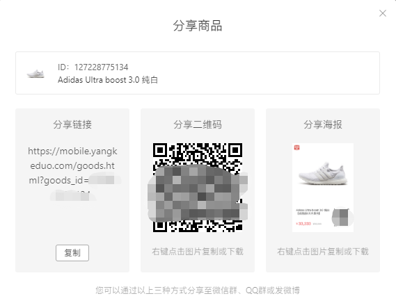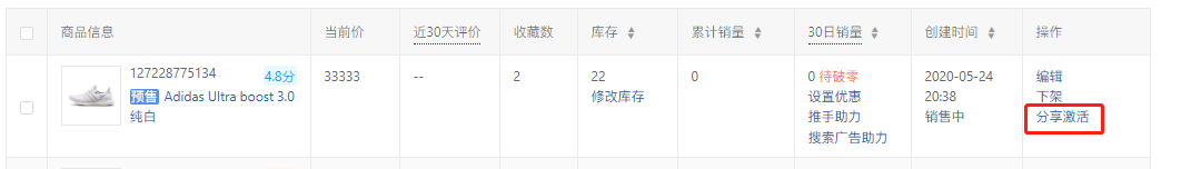 当我们将商品上传后,在商品列表里就会有分享激活按钮。