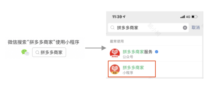 微信搜索“拼多多商家”使用小程序,点击「拼多多商家」,即可进入商家小程序首页
