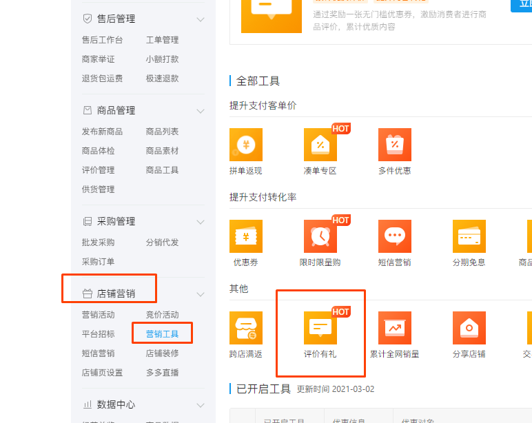 路径:【店铺营销】-【营销工具】-【评价有礼】