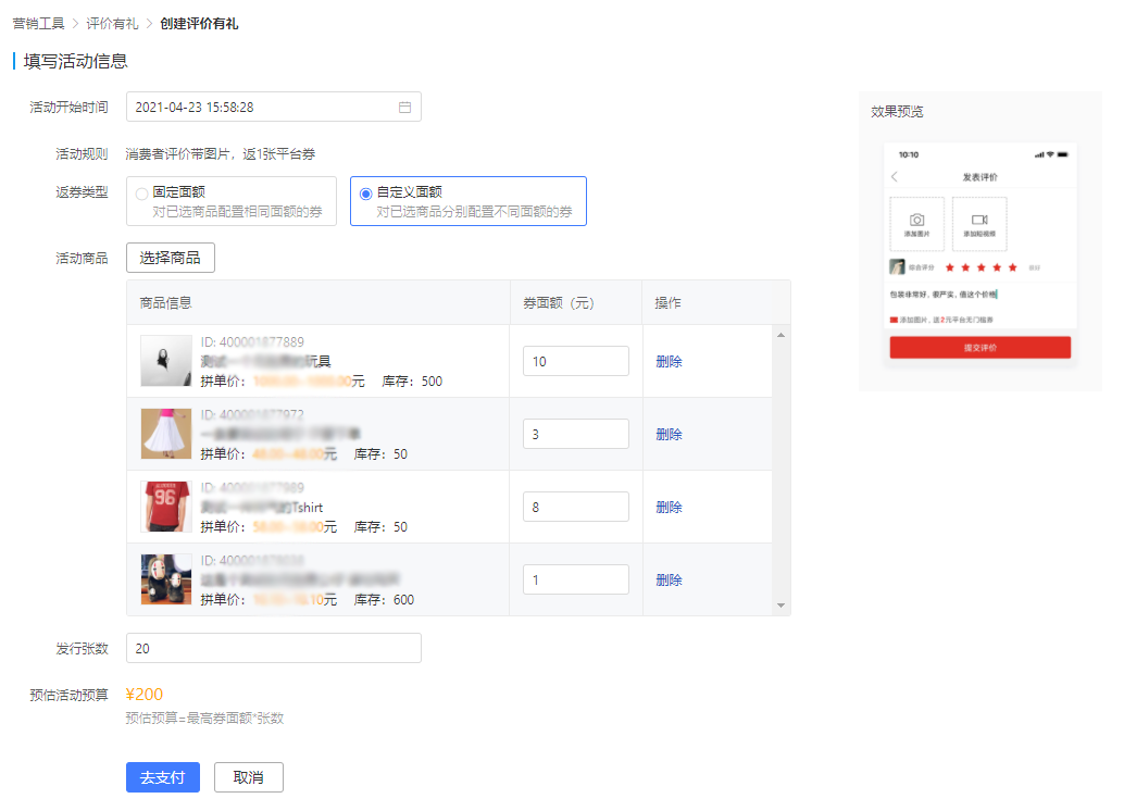 其次,可以在营销工具中,设置【评价有礼】活动,选择对应的商品,进行评价返券,对用户评价进行激励。