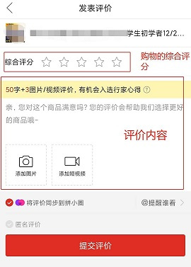 评论内容:指“文字评论”,评价内容可不填、图片可不填(最多6张)。