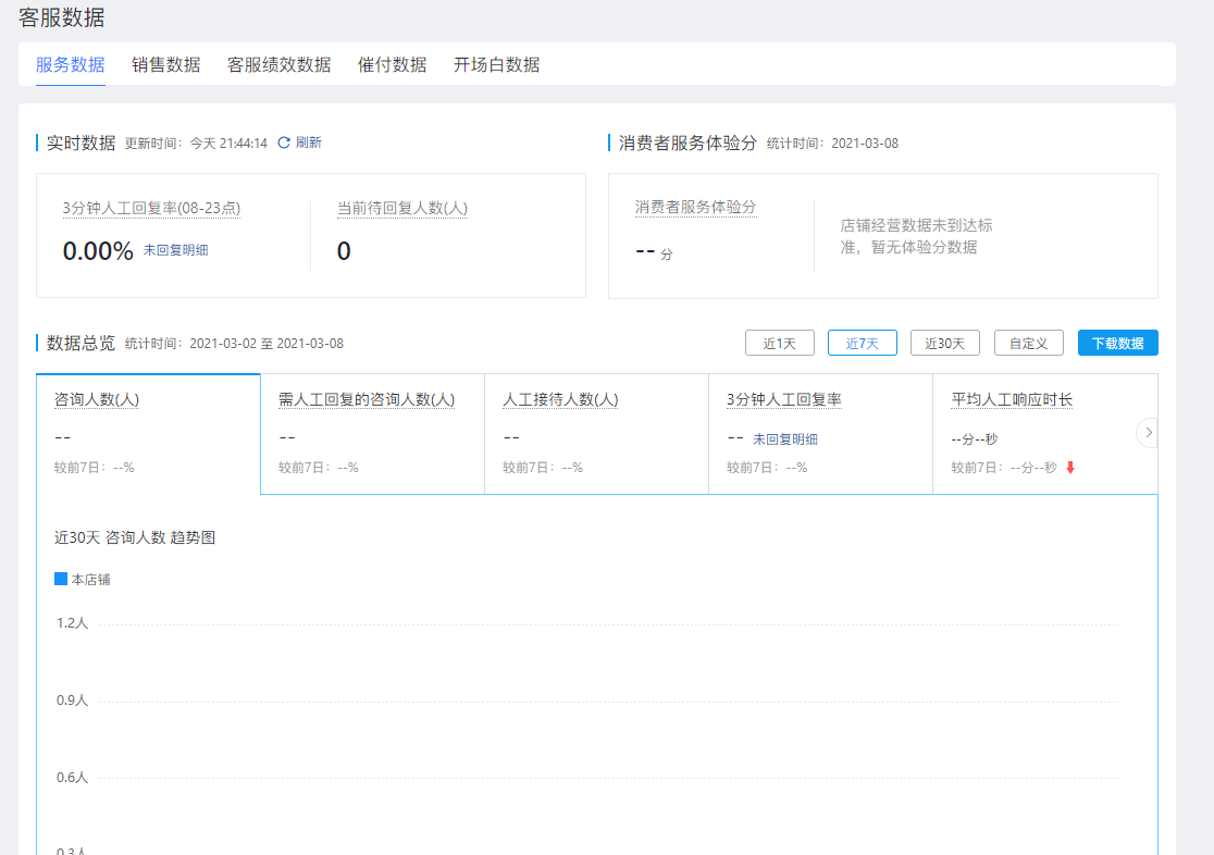 客服服务指标涉及店铺限制和全店商品降权限制处罚,直接影响到商家参加新品上新,9块9特卖,爱逛街等所有资源位活动。商家朋友可以到【管理后台】-【多多客服】-【客服数据】查看客服服务数据。