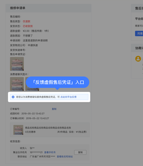 2、售后详情页面(电脑端和网页端):在售后详情页面找到消费者疑似提供虚假售后凭证入口,点击【点此向平台反馈】