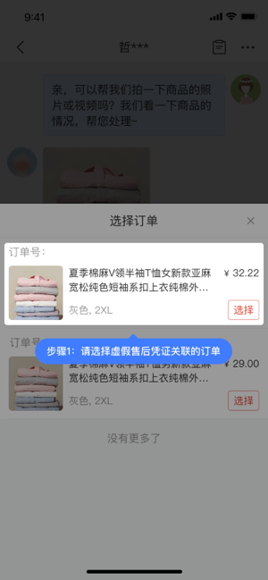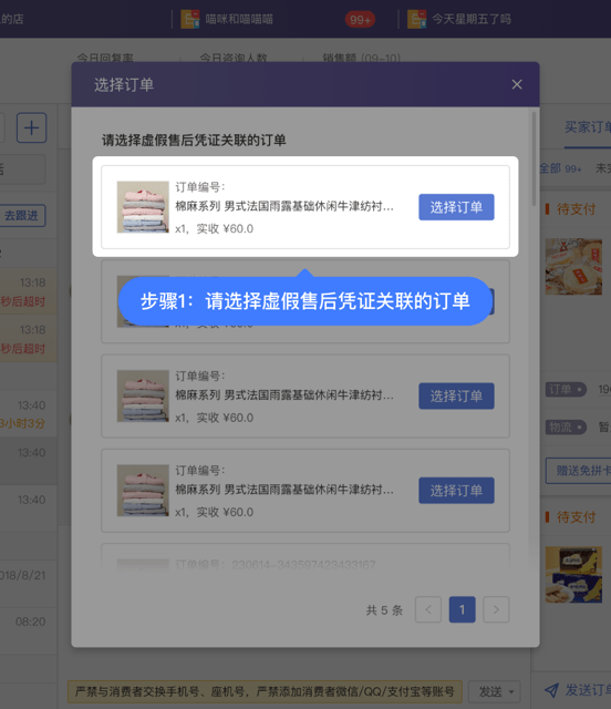 1、如果您通过商家和消费者聊天页面进入虚假凭证举报流程,您需要在弹窗中选择对应订单;如果您通过售后详情页面进入,则直接进入步骤2.