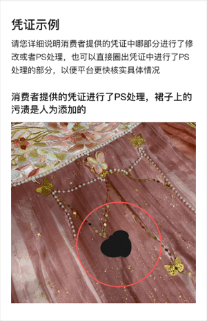 1、如果您认为消费者提供的虚假凭证属于“被修改或PS处理过的图片”,例如,通过图像处理软件(PS、美图秀秀、醒图等),人为进行涂抹、绘画在图片中的商品上添加不存在的瑕疵或损坏痕迹,或者制作虚假的证明文件或图片,请您详细说明消费者提供的凭证中哪部分进行了修改或者PS处理,也可以直接圈出凭证中进行了PS处理的部分,以便平台更快核实具体情况;