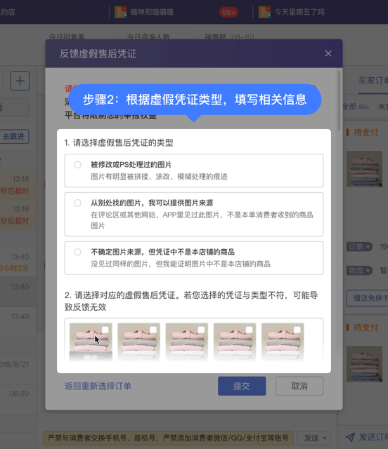 2、选择对应的虚假售后凭证的类型以及凭证,同时按照页面指示进行相关说明并提供凭证