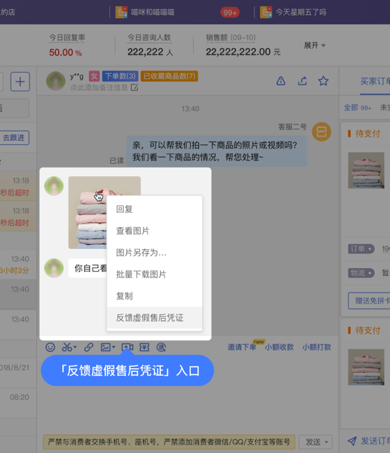 (1)电脑端和网页端:在聊天页面中,右键点击您认为是虚假凭证的图片,选择【反馈虚假售后凭证】