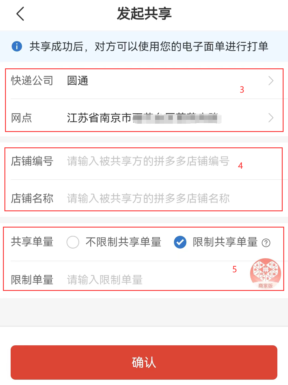 点击【确认】即可完成分享,被共享方即可收到你共享的面单