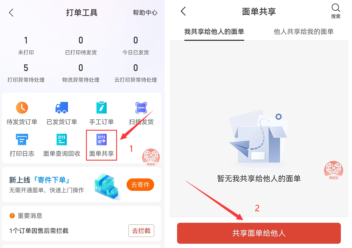 1、官方打单手机端,点击【面单共享】,进入面单共享页面