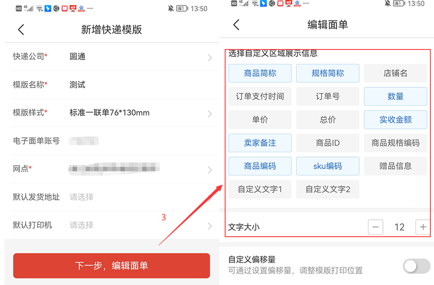 3、点击【下一步,编辑面单】可以对面单自定义区域做编辑,完成模板创建即可进入待发货订单页面,开始打单发货