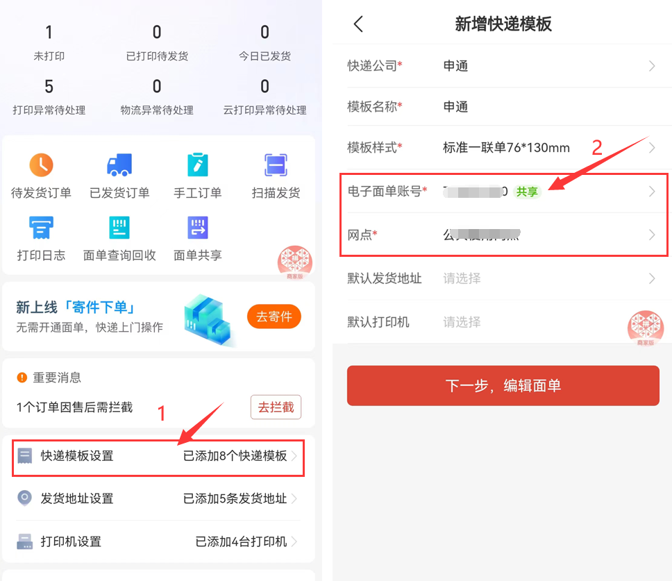 2、新建快递模板,选择对应的快递,填写模板名称,选择共享面单的电子面单账号及网点